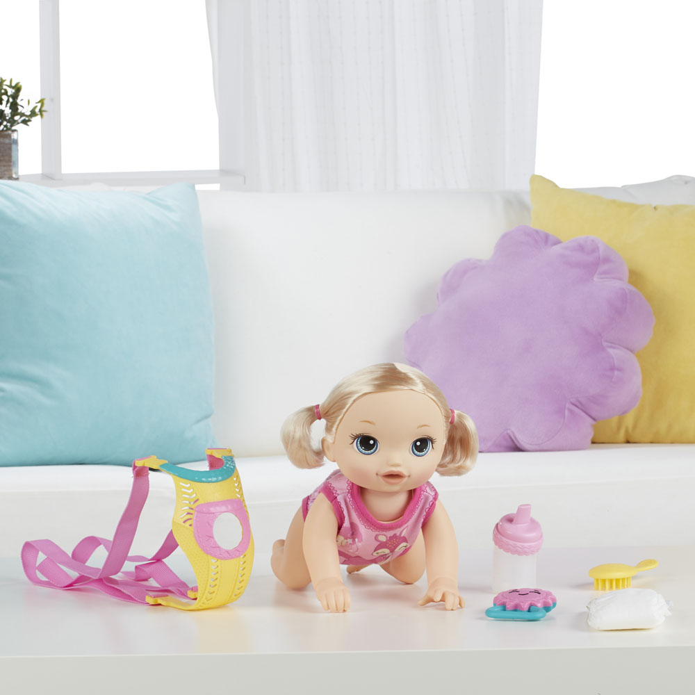 Bebé va conmigo es una muñeca con gran tecnología: gatea, habla, toma agua, hace pipí y tiene más de 25 frases y sonidos diferentes. Con accesorios como portabebés, ropa, sonaja, biberón, pañales y cepillo ¡es como una bebé de verdad!