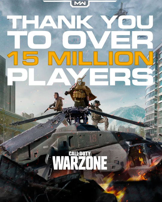 Activision da a conocer que Call of Duty: Warzone superó los 15 millones de jugadores en menos de una semana y lo celebro a través de las redes sociales con una imagen para sus seguidores. El record para el juego fue alcanzado el día viernes, 13 de marzo de 2020.