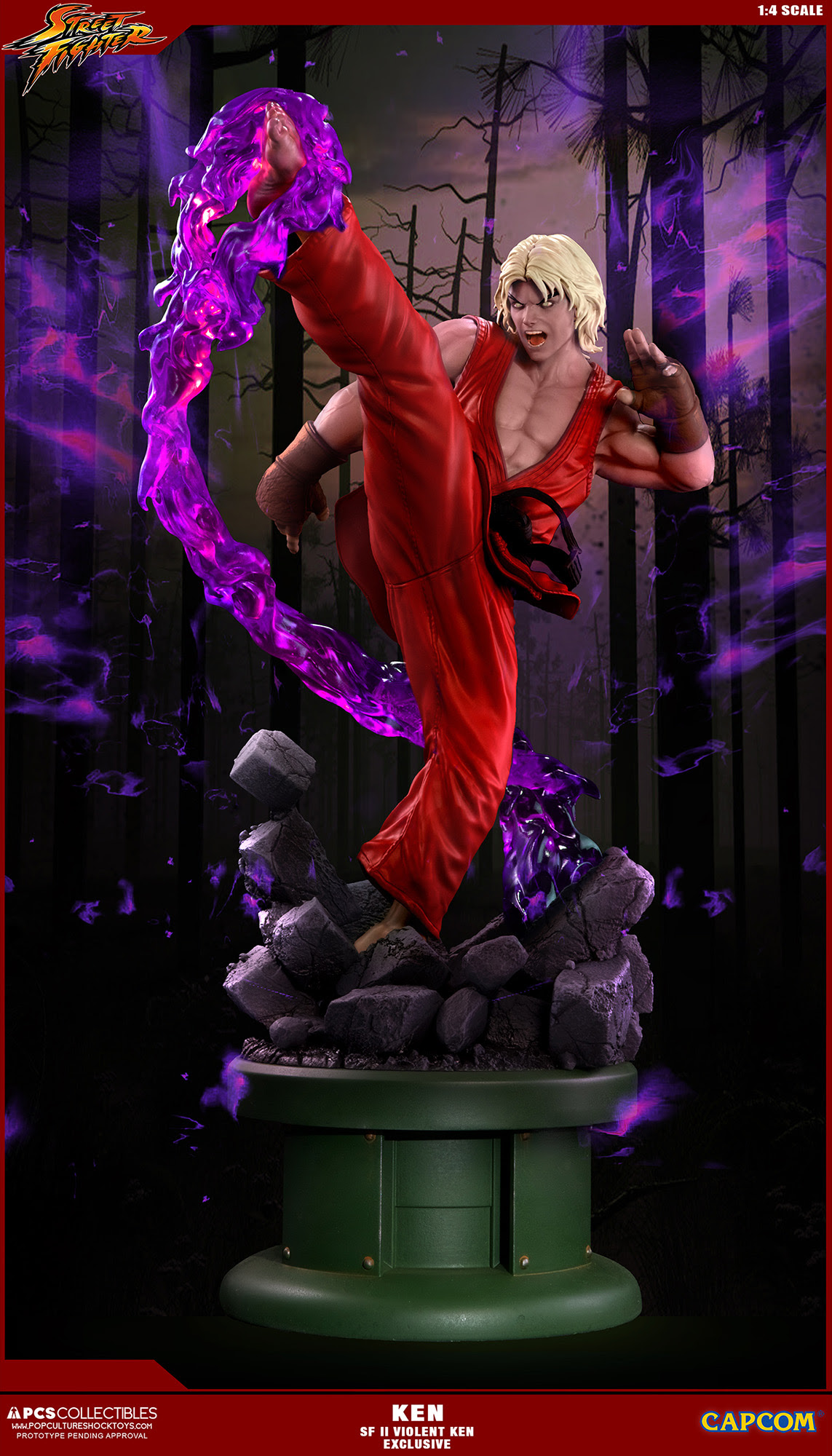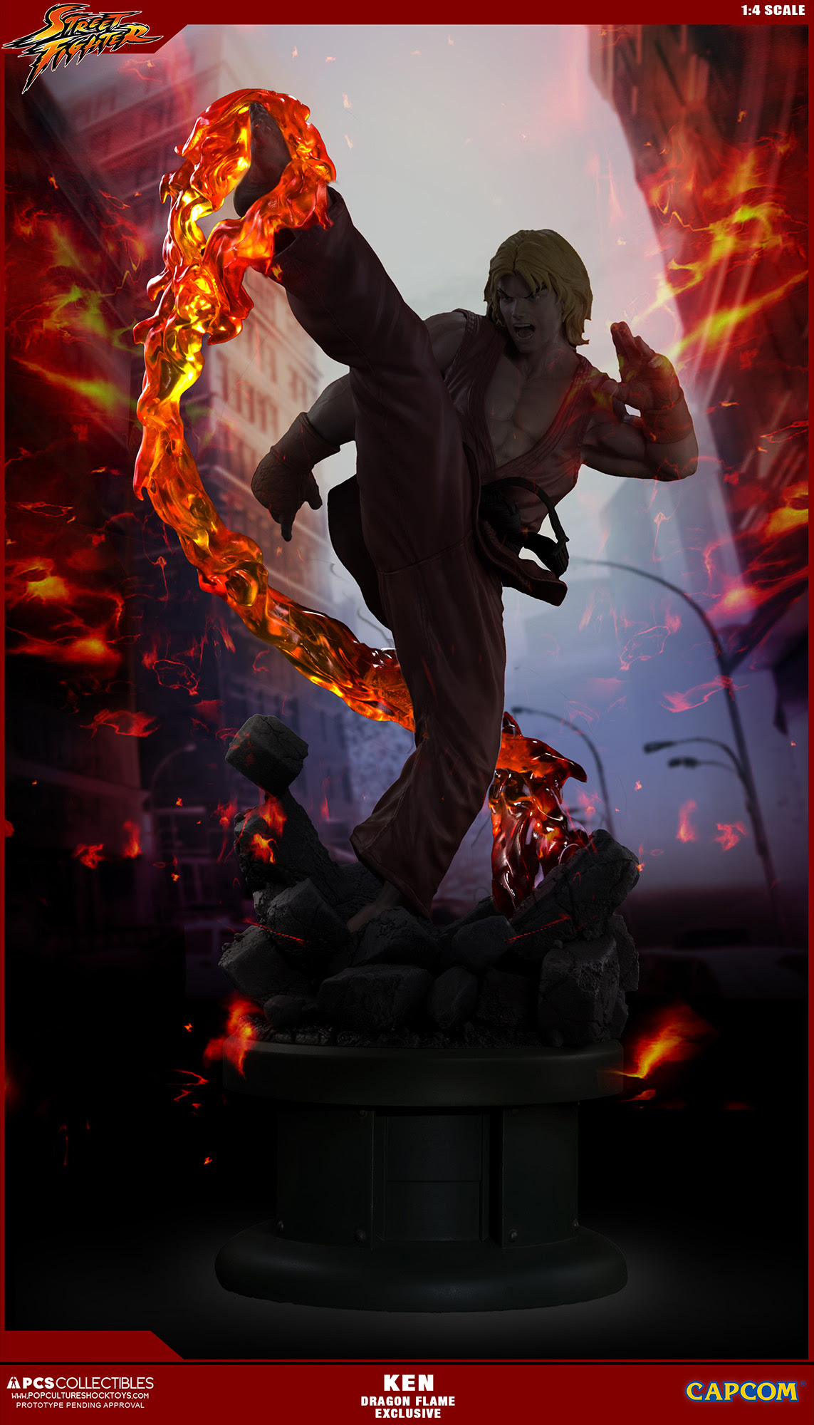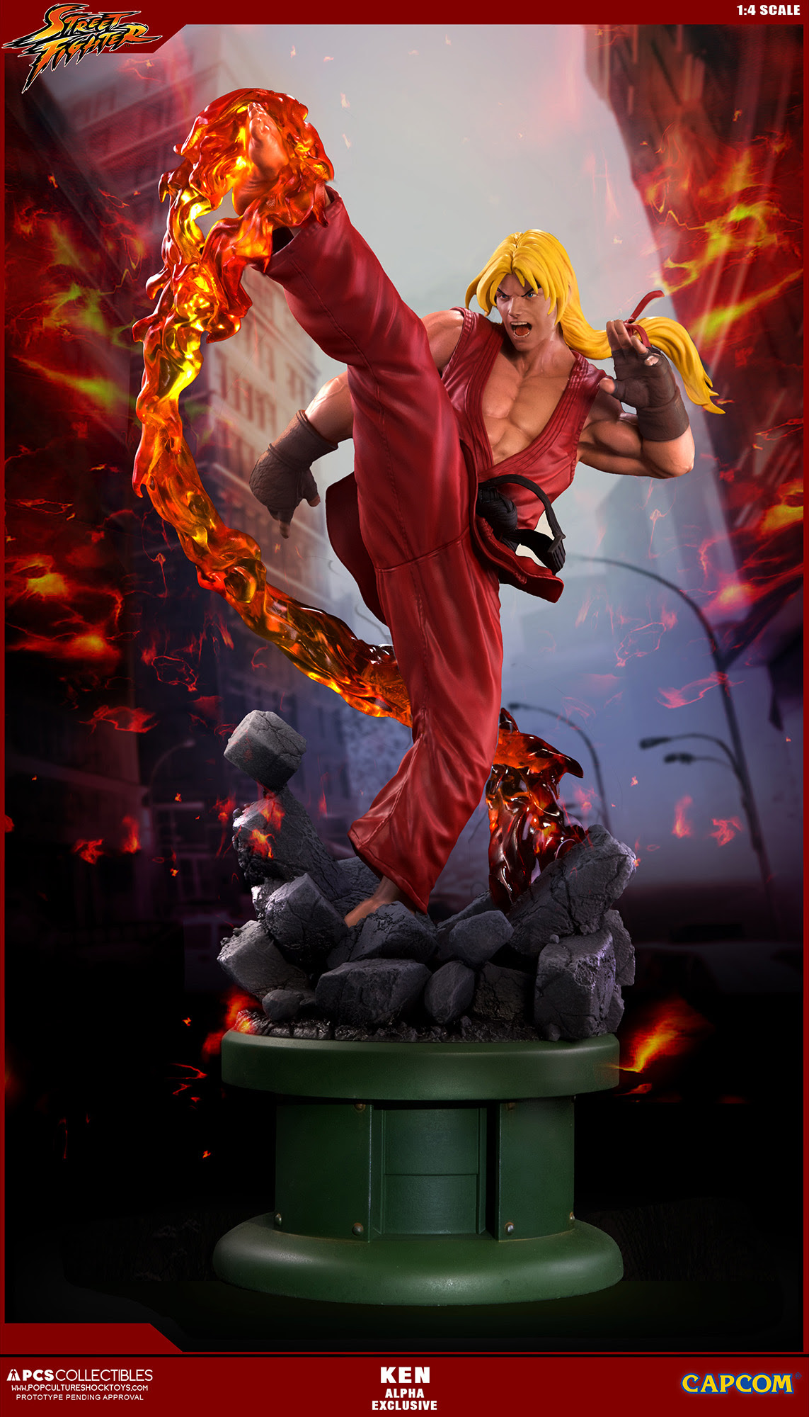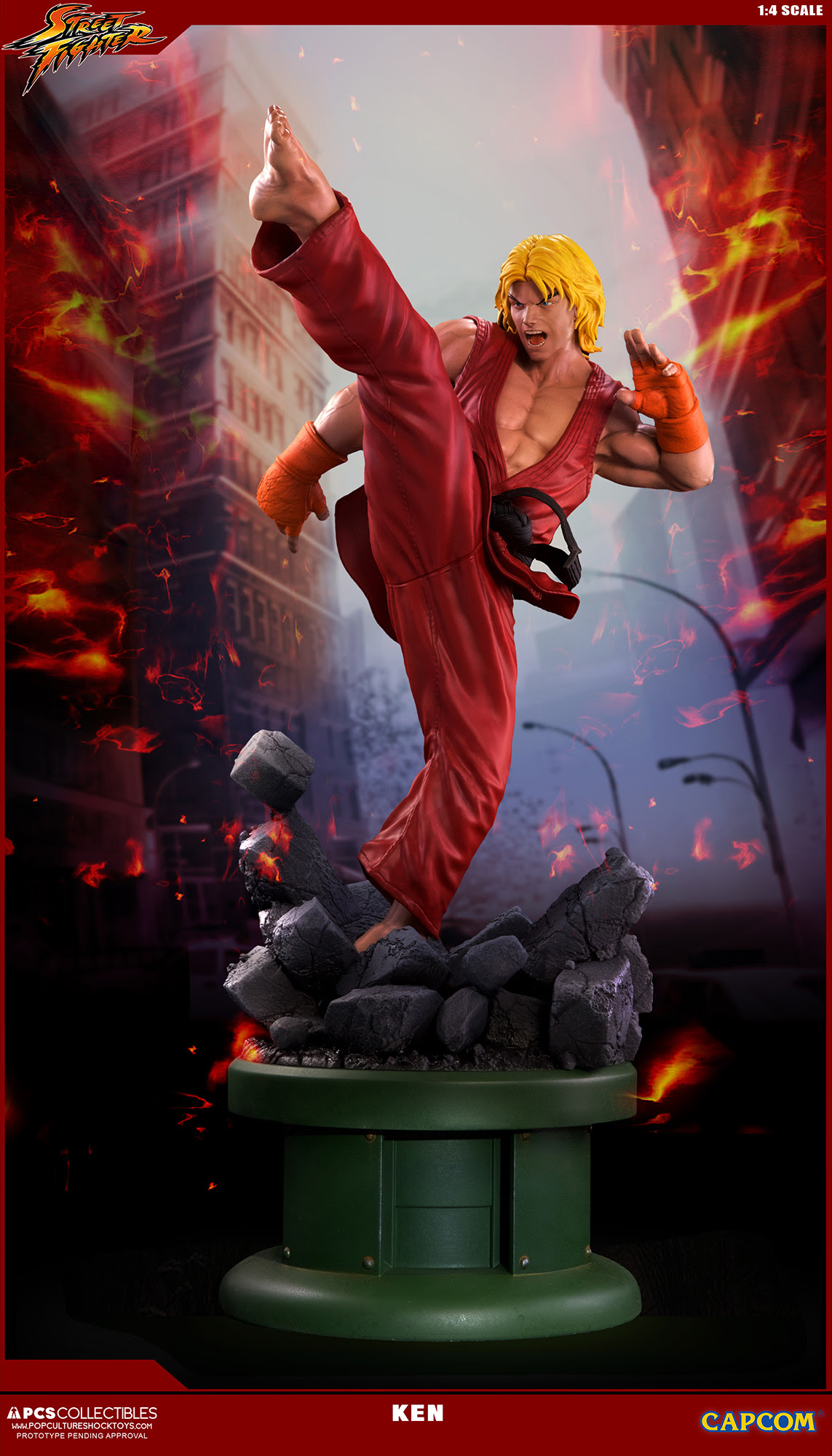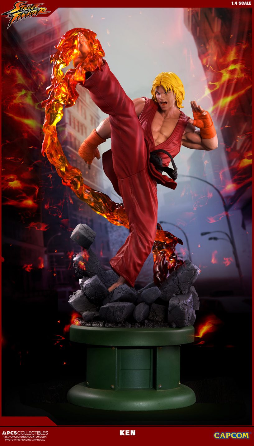 Pop Culture Shock Collectibles presenta su nueva estatua Street Fighter: Ken Masters. El famoso luchador estará disponible, con el estilo en el que apareció en varios títulos de Street Fighter, incluyendo el original, Alpha, y Ultra Street Fighter II. También estará disponible un accesorio opcional, el increíble Dragon Flame.