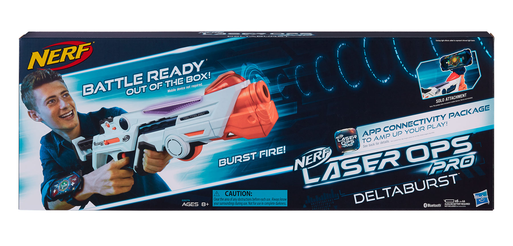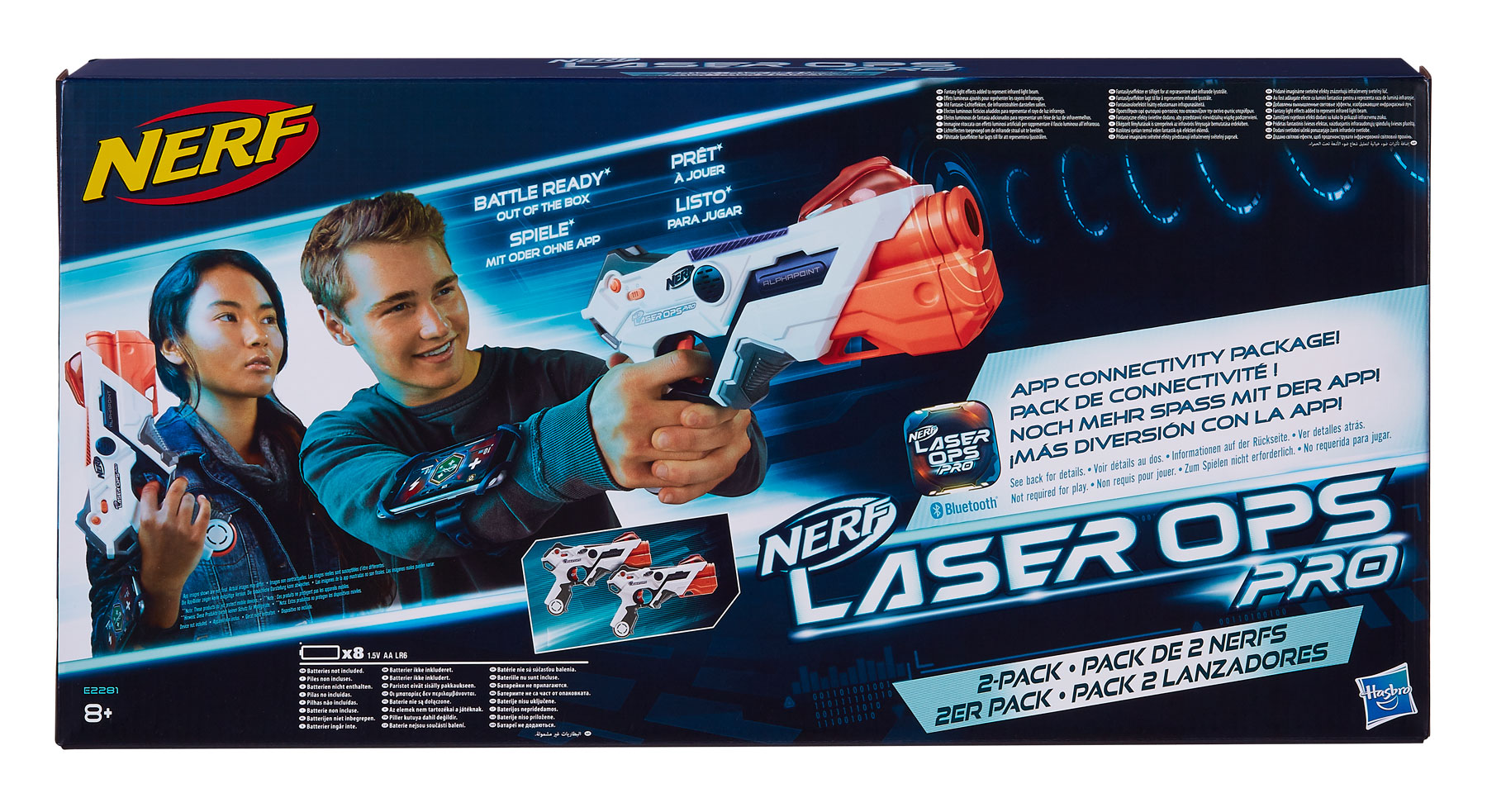 La línea NERF LASER OPS PRO se lanzó con dos productos: DELTABURST, el cual es el más grande y cuenta con una pantalla LCD en la parte posterior que muestra el estado de salud y la capacidad de munición en tiempo real, además viene con un brazalete y el ALPHAPOINT, el cual tiene un envío ilimitado de disparos a los oponentes y también viene con un brazalete. Puedes jugar hasta con 64 oponentes. Competirás solo o en equipo y no tienes que preocuparte porque se terminen las municiones, ya que puedes volver a cargar las veces que lo desees, además los lanzadores cuentan con indicadores visuales y de sonido.