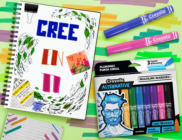 Para Crayola Alternative la creatividad no tiene límites con los distintos trazos y sombras que puedes crear con sus Multiline Markers. Pensando en la practicidad, estos marcadores fueron diseñados para permitirte realizar trazos uniformes en distintas superficies como papel, cartón y corrugados. Son base agua y tienen el beneficio que son libres de tóxicos